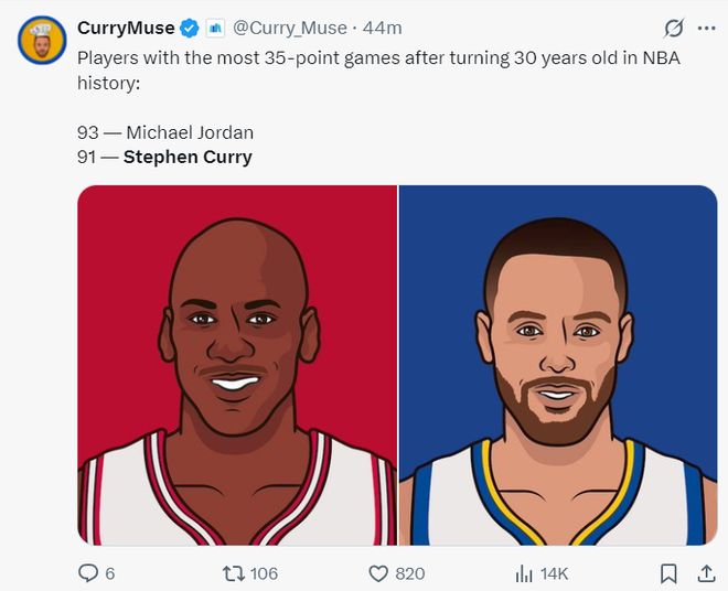 3.30岁后库里拿到43次40+仅次于乔丹。