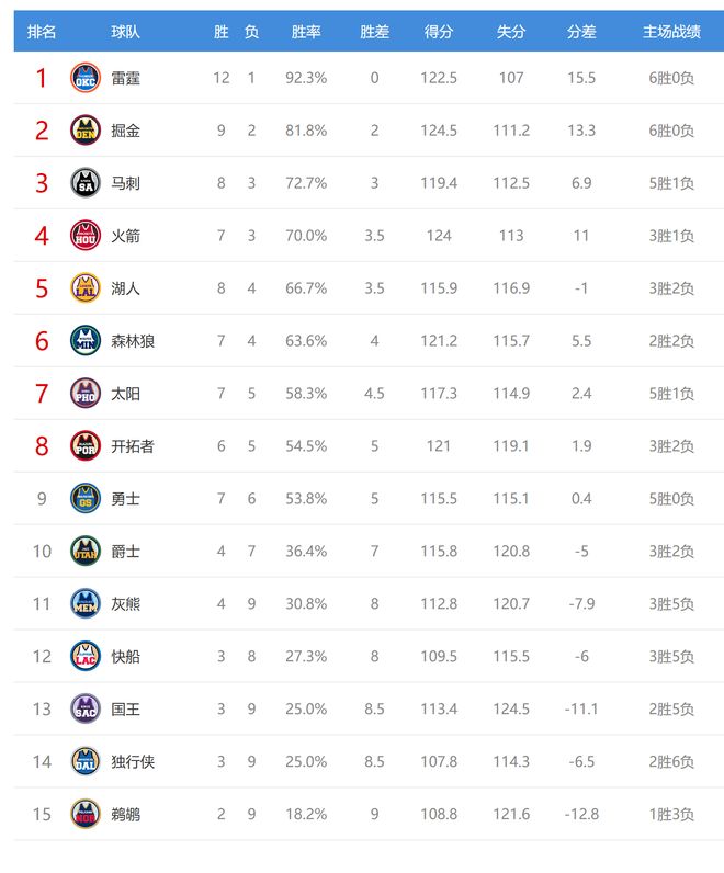 雷霆赢球后4连胜,战绩12胜1负高居联盟第一,湖人输球后8胜4负,排名从西部第四掉到第五。湖人、马刺今日都输球,给火箭送上大礼,火箭的排名反超湖人来到第四,和马刺的差距也只有0.5场了。
